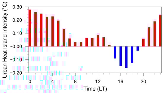 Diurnal variation of the urban heat island intensity (UHII) anomaly in the Wuhan area. The unit is °C. Red/blue bar indicates the positive/negative UHII, respectively.