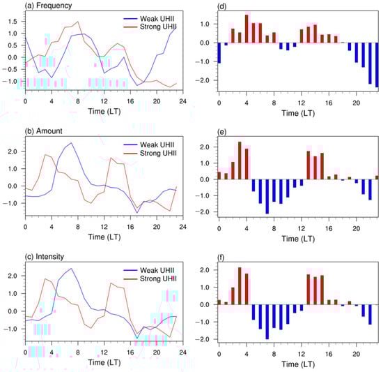 Diurnal variations of frequency (a), amount, (b) and intensity (c) of SDR with strong UHI, and weak UHI, and their difference between SDR with strong UHI and weak UHI (d–f). Red/blue bar indicates the positive/negative difference, respectively.