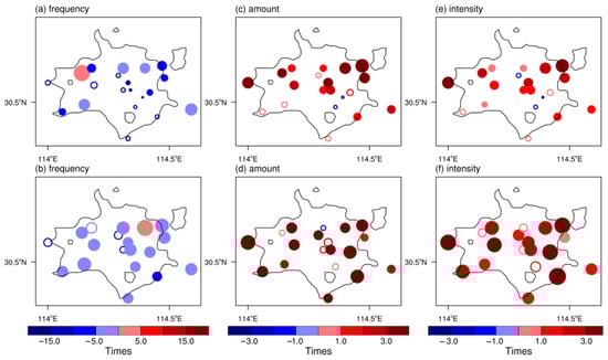 Spatial distribution of different frequency (a), average amount (b) and average intensity (c) between SDR with strong UHI, and weak UHI in the Wuhan area (a,c,e) and night-time (0000–0600 LT) (b,d,f), respectively. The units of rainfall frequency, amount, and intensity are times, mm, and mm/h, respectively; the solid circles/hollow circles indicate statistically significant/insignificant at 90% confidence levels; the black solid line delineates the urban areas.
