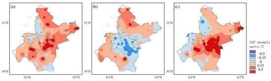 Spatial distribution of average SAT anomaly in five hours before the SDR with strong UHI (a), SDR with weak UHI (b), and their difference between SDR with strong UHI and weak UHI (c). The unit is °C.