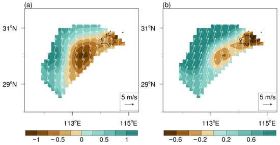 The water vapor flux divergence at 925 hPa at 0200 LT in the Jianghan Plain shows that a nocturnal convergence appears over the center of the Jianghan Plain (Figure 11a). The nocturnal water vapor convergence might explain the aforementioned greater hourly rainfall and SDR at night-time over Wuhan (Figure 3 and Figure 5). However, the nocturnal convergence appears over and downwind of Wuhan urban areas when the urban SDR events are affected by strong UHI during the night-time (Figure 11b). This indicates that the UHI-thermal effect concentrates the widespread nocturnal water vapor flux convergence zone on the Wuhan urban areas, and enhances the urban-rural difference, which is conducive to developing and maintaining urban rainfall events during night-time.