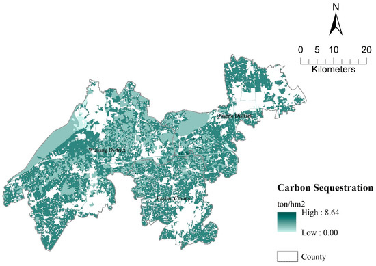 Of the total carbon sequestration capacity, the Wujiang District constituted the majority at 51.09%. Although marginally lower per unit area than Jiashan County’s 232.53 tons/km2, Wujiang District’s larger expanse meant its greater overall contribution (Table 4).