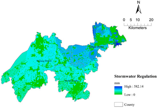This ecosystem service refers to the ecosystem’s function in regulating storm runoff and reducing flood peaks by infiltrating and retaining rainfall through vegetation and water bodies. The physical amount of stormwater regulation service can be calculated using a grid-based model [40,41]: