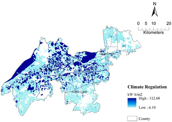 Spatially, the northwestern and northern parts of the ‘two districts and one county’ area, with their contiguous water bodies, exhibit higher intensities (kilowatt hours/km2) of climate regulation service provision (Figure 6). In contrast, the southern regions with agricultural land and impervious surfaces demonstrate lower intensities (Figure 6).