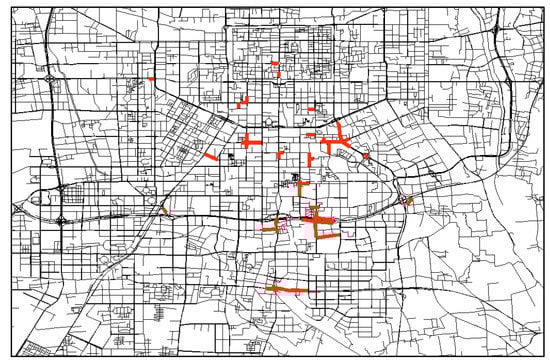 After acquiring the data for the affected road sections, we used ArcGIS to match it to the road network data. Then, we verified the corresponding network edge of the affected road segments through comparison and exported the road network data containing the affected information (Figure 3). The road network was modeled using MATLAB, with the network edges being roads and the network nodes being junctions. On this basis, we analyzed the topological and geographical characteristics of the affected road sections and quantified the impact of urban flooding on the functional indicators of the road network.