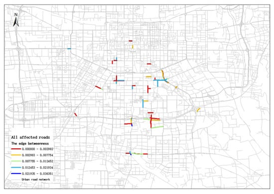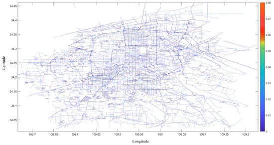 The overall network traffic efficiency was 2.96675 × 10−2 before the disaster and 2.91941 × 10−2 after the disaster, with a 1.6% decrease in network traffic efficiency. This indicates that the number of vehicles passing through road sections and junctions per unit of time has decreased and that the normal flow of traffic has been affected by the waterlogging of the storm. At the same time, the node failure of the affected section will make the traffic flow that should initially flow to the section flow to other sections, which may cause the flow of the surrounding section to exceed its tolerance, resulting in chain congestion of the entire urban section [1].