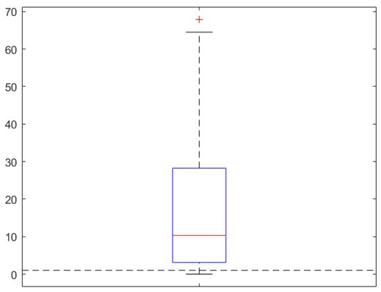 Figure 5 shows the edge betweenness of the affected section. Figure 6 shows the relative values of the edge betweenness of the affected segments compared to the median of the edge betweenness of all segments. As can be seen, most of the relative values are greater than 1, indicating the relative importance of the affected sections. It also indicates that the affected section is the shortest route for most trips, and that the effect of a single point of impact will have a spillover effect, making the surrounding area less efficient overall. Among them, the section with the largest betweenness relative value (outlier) is the east side of the Old District Committee intersection in Chang’an District, with a relative value of 67.8702. This intersection is the center of people and traffic flow in Chang‘an District, and plays an essential role in geography and culture. It is a vital central hub. Chang’an District has a long construction time, and the design capacity of the drainage pipe network is insufficient. In addition, due to the large terrain gap between East Chang’an Avenue and West Chang’an Avenue, the flow kinetic energy is considerable in rainstorm weather. The rainwater pipe is more likely to be overloaded, making it prone to severe water accumulation.