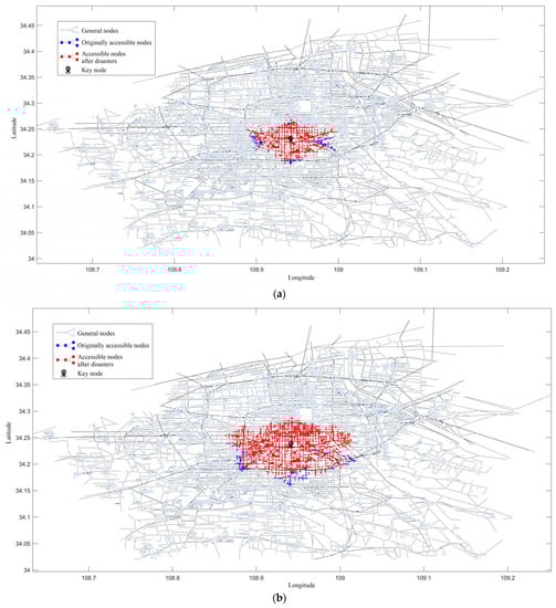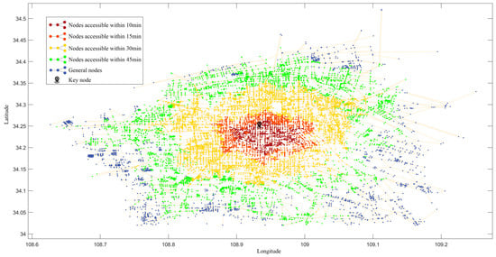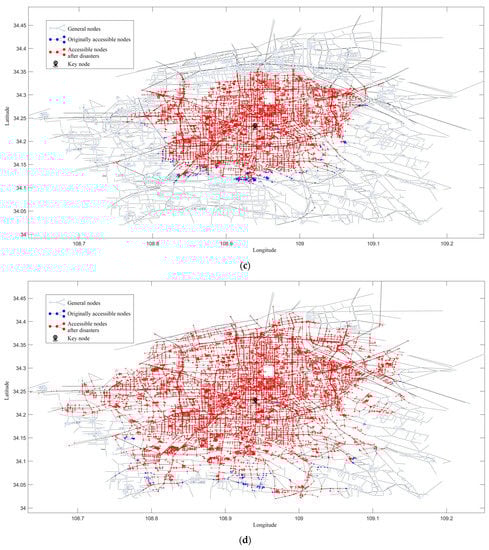 Figure 9 illustrates the distribution of reachable nodes for different time thresholds. As the time threshold increases, the number of reachable nodes increases, the reachability improves, and the number of people who can reach key nodes increases. Some nodes become unreachable within this threshold due to the rainstorm (Figure 10). Most of these nodes are concentrated in the periphery, but some adjacent nodes in the interior are also greatly affected. These nodes are mostly intersection nodes, which are more susceptible to traffic congestion. This is mainly due to their higher importance and being the point where many of the shortest paths pass through, with greater traffic flow.