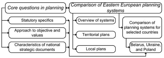 The article constitutes a part of a broader cycle of comparative studies regarding spatial planning systems in Central-East Europe [59]. The first stage involved the comparison of the form of the functioning of local spatial plans in a larger number of analyzed countries. The comparisons were also accompanied by an attempt to present broader features of the compared systems, including key problems and challenges related to their functioning. It should be emphasized that the comparison of solutions does not simply involve a comparison of individual provisions from the selected countries. Broader system analyses involving comparisons of particular solutions are necessary, taking into consideration the specifics and traditions of particular countries, as well as in terms of the applied terminologies. Figure 1 presents an outline of the broader research framework, including the methodology used in our comparative approaches.