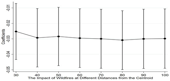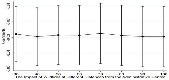 In the benchmark regression, the administrative center of each county is used to count the number of landscape fires in each county. Drawing on the research design of He, Liu, and Zhou [46], the centroid of each county is used as the central standard for robustness testing. The regression results all indicate that when landscape fire disasters increase, this will reduce entrepreneurial activity. As shown in Figure 3, this article visualizes the regression coefficients and 95% confidence intervals of landscape fires within different radial distances from the centroid.