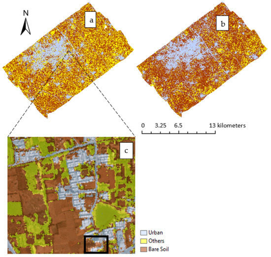 Bare soil-urban map derived using an ensemble of RF and SVM from: (a) AVIRIS-NG; (b) Sentinel-2 images; and (c) magnified section to highlight the separation of classes.