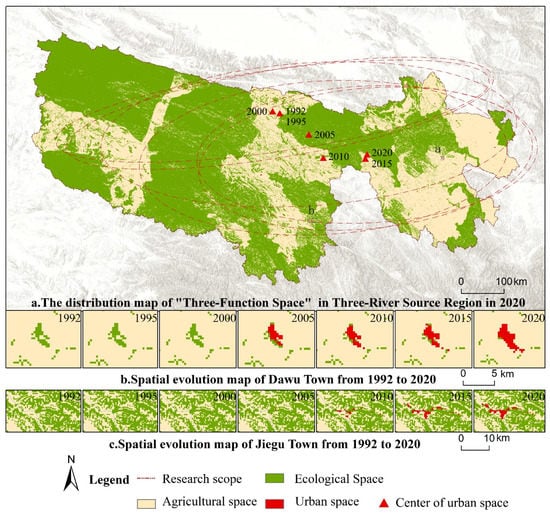 - Zhang, K.; Wei, W.; Zhou, J.; Yin, L.; Xia, J.N. Spatial-temporal Evolution Characteristics and Mechanism of “Three-Function Space” in the Three-Rivers Headwaters’ Region from 1992 to 2020. J. Geo-Inf. Sci. 2022, 24, 1755–1770. [Google Scholar] [CrossRef]
