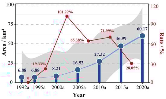 From 1992 to 2020, there have been significant changes in the urban spatial pattern in the Three-River-Source Region (Figure 2 and Figure 3). In 2020, the urban area reached 60.17 km2, accounting for 0.02% of the total land area. Over the course of 28 years, the urban area has increased by a total of 53.29 km2, representing a growth rate of 774.56%. The most significant expansion occurred between 2010 and 2015, with an increase of 19.67 km2 in just one year. The towns of Jiegu and Dawu experienced the most prominent expansion. In terms of spatial distribution, the area of the urban spatial ellipse changed significantly between 2000 and 2005, and the centroid exhibited a trend of eastward and southward movement, indicating increasing spatial dispersion. Looking at the overall centroid, from 1992 to 2005, the center of the urban space remained in Qumarleb County. In 2010, it shifted to Chinadu County, and after 2015, the center moved to Madoi County.