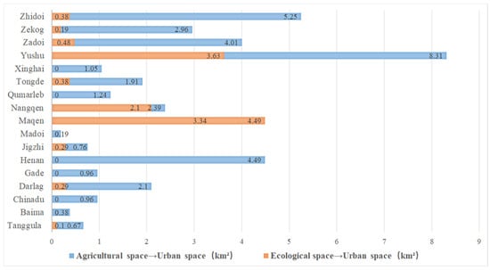 The study indicates that during the research period, urban space experienced continuous expansion and underwent transformations with ecological and agricultural spaces. Particularly, significant dynamic conversions occurred in ecological and agricultural spaces during two crucial time periods: the initiation of the Phase I and Phase II projects of the Three-River Source Ecological Protection and Construction by the government in 2005 and 2015, respectively. This period witnessed distinct characteristics in the three stages: 1992–2005, 2005–2015, and 2015–2020 (Table 5). In terms of transformation sources, agricultural space serves as a significant supplement (Figure 4). Over the past 30 years, the total conversion of agricultural space to urban space amounted to 41.0 km2, mainly occurring after 2005. The conversion was concentrated in the vicinity of county (city) seats, with notable cases in Jiegu town, Jiajiboluo town, and Youganning town. These areas are mostly located on the outskirts of nature reserves and have relatively well-developed transportation conditions. The increased population concentration has driven the demand for urban space. Additionally, the abundant agricultural resources in the surrounding areas have facilitated the conversion to urban space. Moreover, the surrounding agricultural space resources are relatively abundant, making the conversion to urban space easier to achieve. Among them, Jiegu town experienced significant urban space expansion due to post-earthquake reconstruction projects and the development of tourism since 2010. Jiajiboluo town in Zadoi County benefited mainly from the improvement of county and township road networks, facilitating the expansion of urban space. In Henan County, Huangnan Tibetan Autonomous Prefecture, the transformation of urban space in Youganning town was primarily promoted through migration projects [31].