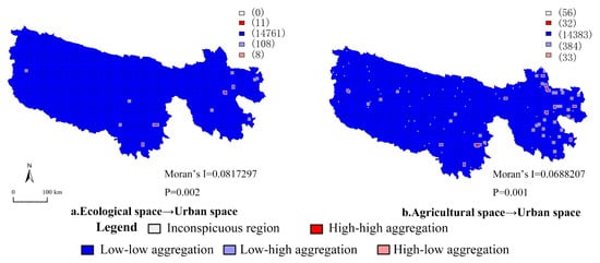 By the end of 2020, the proportions of ecological, agricultural, and urban space were 61.94, 38.04, and 0.02%, respectively. Over the past 30 years, both ecological and agricultural spaces have decreased, while urban space has continued to grow. However, due to the small base of urban space, the overall pattern of the three remains relatively stable. Spatial correlation analysis of the interconversion related to urban space was conducted using spatial analysis tools in GeoDa software, revealing spatial dependence and structure in different locations. By calculating the Moran’s I index, the global spatial autocorrelation of urban spatial type conversions in the Three-River-Source Region was obtained (Figure 5). The results revealed a clustering trend and positive spatial correlation in the urban spaces derived from ecological and agricultural spaces. Specifically, among the grid cells where ecological spaces transformed into urban spaces, 99.2% exhibited an aggregated distribution (LL and LL types), with the majority being LL type cells covering the entire study area. Dispersed distribution (LH and HL types) accounted for only 0.8% and was mainly concentrated in county seats and urban centers. Regarding the grid cells where agricultural spaces transformed into urban spaces, 0.4% showed non-significant autocorrelation, 0.2% exhibited HH-type distribution, primarily concentrated in the urban centers of Yushu City, Nangqian County, Zadoi County, Madoi County, Henan County, and Jiuzhi County. Furthermore, 96.6% exhibited LL-type distribution, widely distributed throughout the study area, while LH-type distribution was located on the outskirts of HH and HL types, mostly concentrated in the eastern part of the study area.