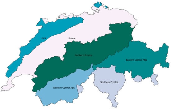 The study area covers all of Switzerland between the latitudes of 45.82° and 47.81° and the longitudes of 5.96° and 10.49°. The total land area is 41,285 km2. Switzerland can be divided into 6 biogeographical regions (Figure 2), which are based on zones of homogeneity of flora and fauna, as well as hydrologic and topographic features present [,].