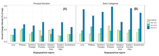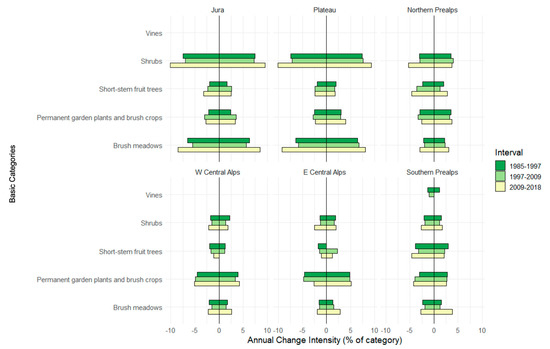 As a contrast to gains in buildings that are only above uniform intensity in the first interval, annual percentage losses in the minor categories of artificial areas are greatest in 2009–2018, in all regions (Figure 6). The Jura and Plateau regions show much greater annual change intensities than the alpine regions, driven by changes within vegetated LC classes (Figure 7 and Figure 8).