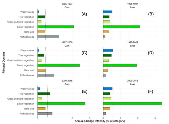 Category intensity change of NOLC04 Principal Domains between survey periods. The dashed line indicates uniform intensity from the overall change. Each pair of graphs represent gains (A,C,E) and losses (B,D,F) between the periods of 1985–1997, 1997–2009, and 2009–2018.