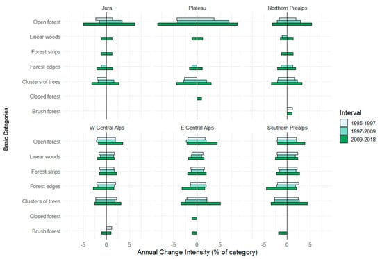 Greater changes in marginal forest areas, such as Forest Strips and Forest Edges, can be observed in the alpine regions compared to the Plateau and Jura, and a lower rate of change in open forest reflects the difference in management strategies [].