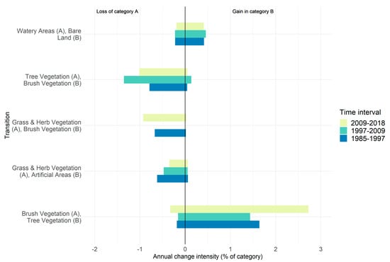 A transition between two classes, A and B, can be viewed as a dominant signal of change if class A systematically loses surface to class B, while at the same time class B systematically gains surface from class A []. At the national scale, the most important change signals are the gain in Tree Vegetation from Brush Vegetation categories, for which there is a clear increase in the 2009–2018 period compared to other years (Figure 9). The intensity of gain of Tree Vegetation from Brush Vegetation is not equivalent to the intensity of loss from Brush Vegetation to Tree Vegetation, as these values are calculated based on the initial size of the changing category in question.