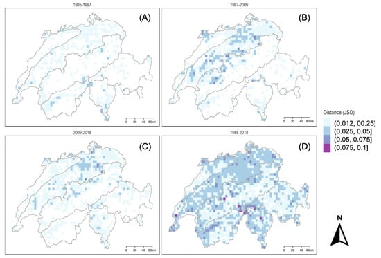 Spatial dissimilarity between periods 1985–1997 (A), 1997–2008 (B), and 2009–2018 (C) as well as the overall survey period 1985–2018 (D) using the Jensen–Shannon divergence at a 25 km2 resolution for comparison based on NOLC04 Basic Categories. JSD is calculated for groups of 25 pixels which aggregate to 25 km2 tiles.