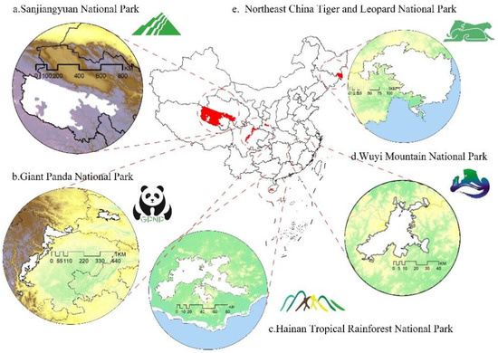 National parks have the greatest biodiversity and ecological integrity [31]. The first batch of national parks in China are nationally representative and ecologically significant, including not only as the cherished habitats of animals and plants, but also as significant ecological source areas. Among them, Sanjiangyuan National Park is the first national park in China and the largest national park in the world. It is located in Qinghai Province, with an adjusted total area of 19 × 104 km2. As the source catchment area of the Yangtze River, the Yellow River, and the Lancang River, known as the “China Water Tower”, it is an important freshwater source in China and even Asia, known as the “alpine biological germplasm resource bank”. It is also one of the most sensitive regions for the global climate change response [33]. Its ecosystem service functions, natural landscape, and biodiversity have a conservation value of national and global significance. Giant Panda National Park mainly protects the giant panda, an endemic species in China, and the establishment of Giant Panda National Park is conducive to enhancing the connectivity, coordination, and integrity of the giant panda habitat and realizing the stable reproduction of the giant panda population. Giant Panda National Park is located in the western region of China, spanning Sichuan, Gansu, and Shaanxi provinces, with a planned area of 2.2 × 104 km2 [34]. Hainan Tropical Rainforest National Park, located in Hainan Province, with a planned area of 4269 km2, is the main habitat of Hainan gibbons, which are national-level protected animals in China. The Hainan tropical rainforest is a globally important gene pool of germplasm resources, an important area for tropical biodiversity conservation in China, and one of the hotspots for global biodiversity conservation [35]. Wuyi Mountain National Park, straddling Jiangxi and Fujian provinces, is a World Man and Biosphere Reserve and a World Natural and Cultural Heritage National Park, with a planned area of 1280 km2 [36]. North Tiger and Leopard National Park is located at the junction of Jilin and Heilongjiang provinces, and it is the most abundant, active, and important settlement and breeding area for northeast tiger and leopard populations in China; it is also an important wildlife area and one of the richest areas of biodiversity in the temperate zone of the Northern Hemisphere, with a planned area of 1.41 × 104 km2 [37]. The distribution of the five national parks is shown in Figure 1.