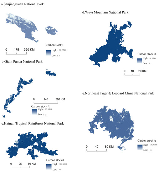 According to the actual situation, the planning process of China’s national parks has carried out zoning designs with different degrees of protection, basically covering core protected areas and generally controlled areas. To improve the ecosystem service functions of the national parks and protect the integrity of their ecosystems, ecological migration relocation, ecological restoration, and expansion of wildlife habitat space are the main protection means in the core protected areas of the national parks. This study identified areas of carbon stock reduction in the national parks, which can facilitate the implementation of targeted control measures in each national park (Figure 8).