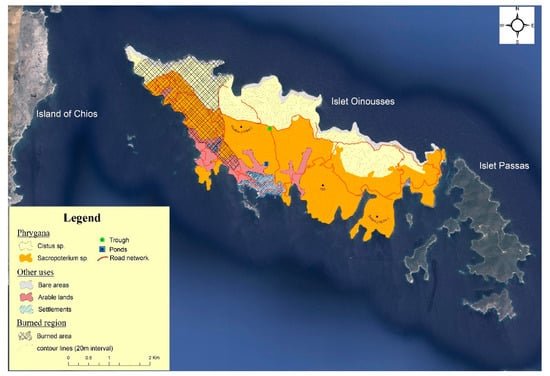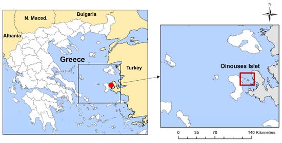 The study was conducted in Oinousses islet (38°20′00′′ N, 26°08′00′′ E, 80 m a.s.l.), which is in the Eastern Aegean Sea in May 2013. The islet is located in the sea channel between the NE coast of Chios Island (Greece) and the western coast of Anatolia (Turkey) (Figure 1). Oinousses islet covers an area of 14 km2 and belongs to the NATURA 2000 network. The mean annual temperature is 10.2 °C, and the mean annual precipitation is 556 mm. The climate is classified as Mediterranean, with mild winters and dry, very hot summers, and as Csa, according to the bioclimatogram of Emberger and the Köppen–Geiger classification, respectively [17]. The most important economic activities in the area are livestock production, agriculture, and fishing. Rangelands cover 90.8% of the area, dominated by sclerophyllous scrub vegetation. These semi-natural formations, mainly of garigue–phrygana, have also occupied the abandoned agricultural terraces. The rangelands of Oinousses islet are public and communally grazed by small ruminants, mainly goats with approximately 1000 heads, throughout the year.