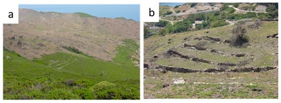 (a) Burned and the adjustment unburned area in Cistus creticus low formations; (b) Burned abandoned terraces with Cistus creticus.