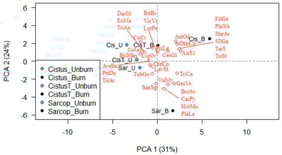 Biplot of principal component analysis based on the floristic composition in vegetation types (1) Sarcopoterium spinosum (Sarcop), (2) low formations of Cistus creticus (Cistus), and (3) low formations of Cistus creticus in abandoned terraces (CistusT) in burned (Black dot) and adjacent unburned sites (Blue dot). AirEl: Aira elegantissima, AntOd: Anthoxanthum odoratum, AveBa: Avena barbata, BitBi: Bituminaria bituminosa, BriMa: Briza maxima, BroSc: Bromus scoparious, CarPy: Cardus pycnocephalus, CerGl: Cerastium glomeratum, CisCr: Cistus creticus, CisSa: Cistus salviifolius, CreCo: Crepis commutate, DacGl: Dactylis glomerata, EriMa: Erica manipuliflora, FilGa: Filago gallica, GasVe: Gastridium ventricosum, HorMu: Hordeum murinum, LagOv: Lagurus ovatus, LavSt: Lavandula stoechas, LotPe: Lotus peregrinus, OrnCo: Ornithopus compressus, PetDu: Petrorhagia dubia, PisLe: Pistacia lentiscus, PlaLa: Plantago lanceolata, PlaWe: Plantago weldenii, SarSp: Sarcopoterium spinosum, SheAr: Sheradia arvensis, SilGa: Silene gallica, TarS: Taraxacum sp, TriAn: Trifolium angustifolium, TriAr: Trifolium arvensis, TriCa: Trifolium campestre, TriSt: Trifolium stellatum, TubGu: Tuberaria guttata, VicVi: Vicia villosa, VulMy: Vulpia myuros.