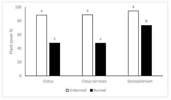 Plant cover in the unburned sites did not differ among the vegetation types, while in the burned ones, it was found higher in the S. spinosum low formations (Figure 4).