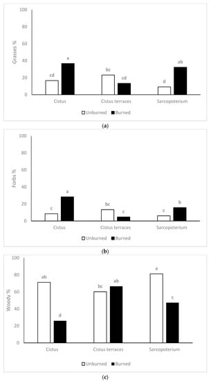 The percentage of grasses was significantly lower in the terraces with C. creticus than the other vegetation types in the burned area, while in the unburned area, it was higher than that recorded in the S. spinosum low formations. Grass percentage increased in the burned areas with low formations of C. creticus and in S. spinosum but burning did not affect their presence in the terraces with C. creticus (Figure 5a). The percentages of forbs were significantly higher only in the burned sites with low formations of Cistus creticus and with S. spinosum. Grass percentage was higher in the burned low formations of C. creticus compared to the other burned vegetation types, while no significant difference was recorded among the unburned vegetation types (Figure 5b). Woody species percentage was not changed with burning in the terraces with C. creticus, while it decreased in the other vegetation types. It was significantly higher in the burned terraces with C. creticus that in the other burned vegetation types (Figure 5c).