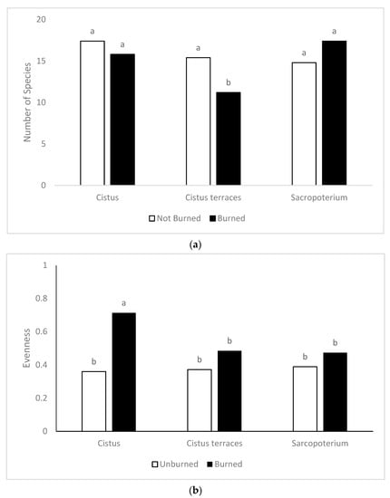 The floristic diversity was higher in the burned sites compared to the unburned ones. There are many reports about the positive effect of fire on floristic diversity in rangelands [63,64,65]. In particular, for fire-prone ecosystems such as the phryganic, fire has been proposed as a major driver of their diversity [66]. This positive effect mainly contributed to the decrease of the competitive woody species and the increase of the other functional groups.