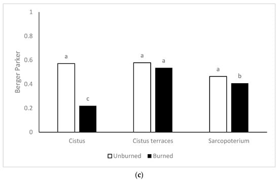The number of species was significantly reduced only in the burned terraces with C. creticus (Figure 6a). No differences in Evenness were detected among the not burned vegetation types, while in the burned ones, Evenness was significantly higher in the low formations of C. creticus. Only in this vegetation type had burning significantly increase this diversity index (Figure 6b). Berger Parker dominance index was significantly higher in the burned terraces with C. creticus followed by low formations of S. spinosum, while no differences were found among the unburned vegetation types. Burning did not affect this index in the terraces with C. creticus (Figure 6c).