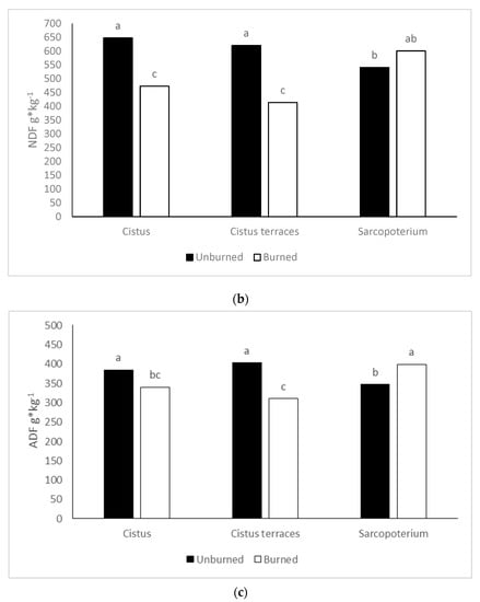 The NDF and ADF contents in both the burned sites dominated by C. creticus were lower than those not burned, while the opposite trend was recorded in the S. spinosum, being, however, significant only for the ADF. The NDF and ADF contents in both unburned sites with C. creticus were significantly higher than that of S. spinosum, while in the burned sites, the results were the opposite (Figure 7b,c).