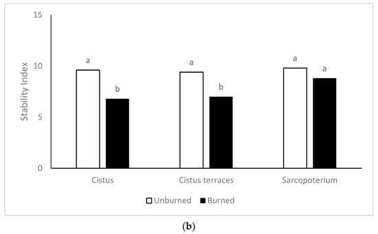The landscape composition index in the burned sites was significantly lower in the low formations of C. creticus in the abandoned terraces compared to the other vegetation types. At the same time, in the unburned area, no significant differences were detected among vegetation types. Burning reduced the landscape composition index only in the low formations of S. spinosum (Figure 8a).
