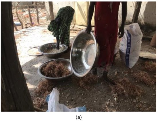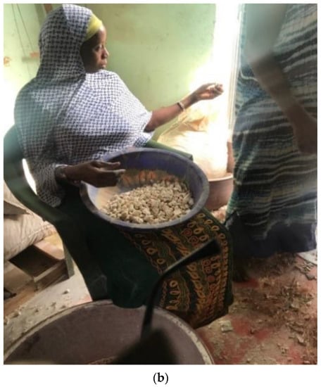 (a) Women processing the baobab fruit pulp. (b) Women processing the baobab fruit pulp for grinding.