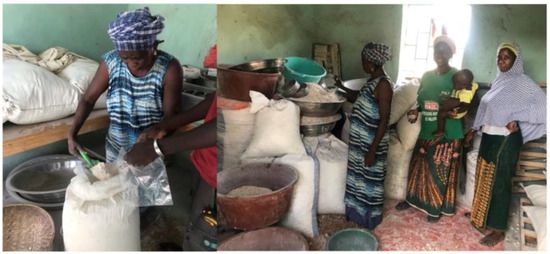 Notably, the concept of transforming baobab fruit for commercial purposes arose in the Boundou region as a result of the region becoming a protected area. Based on our findings, it is reported that the reason why the area was designated a protected area was to rely on the preservation of the environment to promote local development and to improve the living conditions of local populations. Baobab’s transformation began in 2013 in Koussan village as an empowerment program for the women of the community. The women were trained in how to process the baobab pulp fruit into locally produced powdered form. Interestingly, the men did not show interest in the training as they consider this process to be a woman’s job, even at this present time. The men were only responsible for collecting the baobab fruit from the forest. To transform the baobab fruit into powdered form, the women must first separate the fruit pulp from the chaff (Figure 4), after which they grind it meticulously until it reaches the desired consistency. Our focus group conversation with the women of Koussan village revealed that in 2018, an NGO donated a grinding machine to the community to aid in the processing of baobab pulp fruit to powder. This machine was made freely available to all women’s groups actively involved in the business across the Boundou region. However, at the time of our study, the machine was not functional, and the women had resorted to manually grinding the baobab fruit with a mortar and pestle.