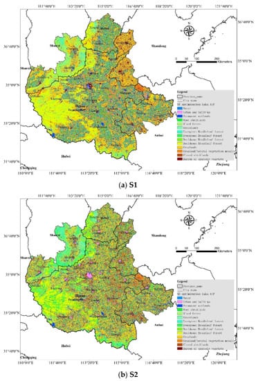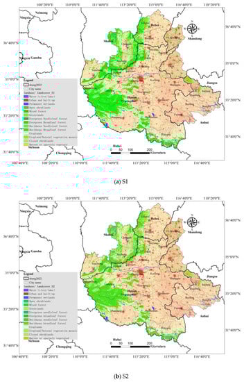 Development scenario (S2): According to the evolution trend from 2010 to 2020, urban and built-up areas rapidly expanded to the periphery with an increase of 209,237 ha. Urban expansion land mainly came from adjacent open shrublands, closed shrublands, grasslands, croplands, mixed cropland/natural vegetation areas, and barren or sparsely vegetated areas.