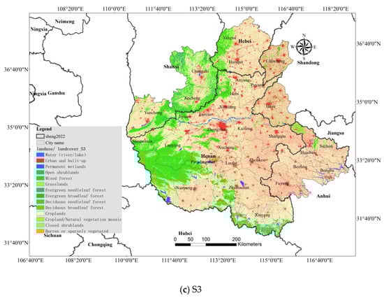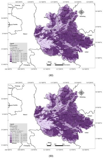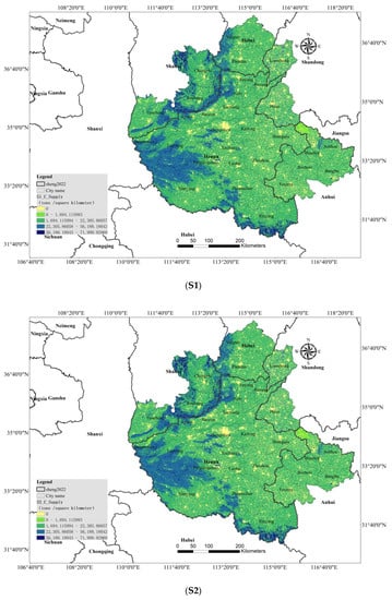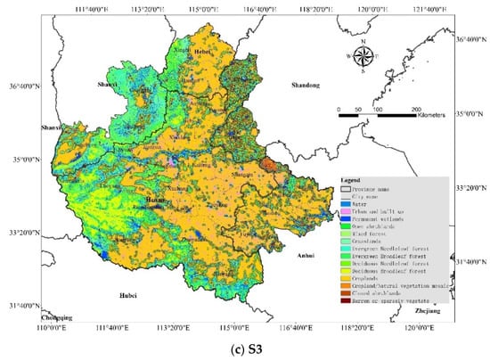 Regarding the optimised planning (S1; 33,821 ha) and development (S2; 209,237 ha) scenarios, open shrublands, closed shrublands, grasslands, croplands, and mixed cropland/natural vegetation adjacent to urban and built-up and barren or sparsely vegetated areas were mainly converted into urban and built-up areas (S1: 33,821 ha; S2: 209,237 ha), leading to severe fragmentation of land use structure in the middle of S1 and S2 after optimisation, damaging the integrity of the ecosystem in the central region, which may affect ecosystem service processes and functions and reduce the sustainable supply capacity of ecosystem services. In the optimised conservation scenario (S3), water, evergreen needleleaf forests, evergreen broadleaf forests, deciduous needleleaf forests, mixed forests, closed shrublands, open shrublands, grasslands, and permanent wetlands adjacent to 194,855 ha of croplands and urban and built-up areas were converted into evergreen needleleaf forest, evergreen broadleaf forest, deciduous needleleaf forest, mixed forest, closed shrubland, open shrubland, grassland, or permanent wetland. After land use optimisation and adjustment, the ecological land structure of S3 was complete; the ridgelines of Taihang Mountain, Funiu Mountain, and Liankang Mountain in the north, west, and south were more continuous; the river corridor structures of the Yellow River and Huaihe River were more complete; and the croplands in the middle were distributed in concentrated contiguous areas. The land use structure was more consistent with the study area’s ecological protection and urban development vision. Therefore, S3 was selected as the optimal scenario in this study.