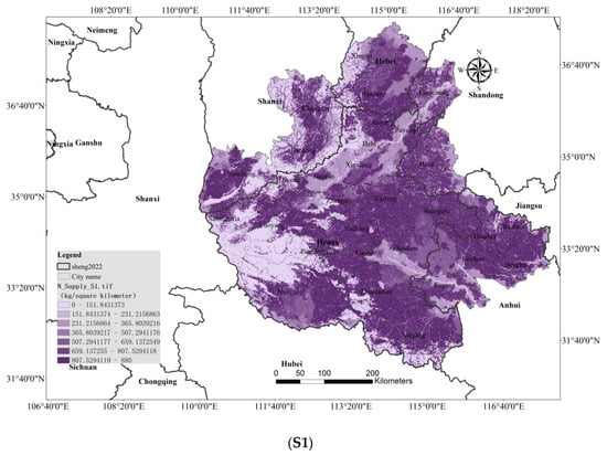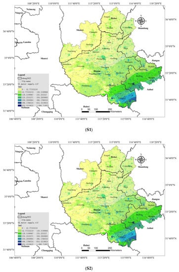 (1) Before optimisation, S1 could supply 33.66 billion cubic metres of freshwater, 57,600 tons of purified water (N retention), and 2.94 billion tons of carbon service; S2 could supply 34.10 billion cubic metres of freshwater, 57,200 tons of purified water (N retention), and 2.94 billion tons of carbon service; and S3 could supply 33.400 billion cubic metres of freshwater, 57,400 tons of purified water (N retention), and 3.04 billion tons of carbon service. The water supply service had a spatial pattern of less in the north and more in the south, the carbon service had a pattern of more in the west and less in the south, and the water purification (N retention) service had a pattern of high values in the periphery and low values in the central farmland area.