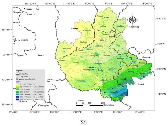 Spatial distribution pattern of freshwater service supply under different scenarios: (S1) Spatial distribution pattern of freshwater service supply under scenario S1; (S2) Spatial distribution pattern of freshwater service supply under scenario S2; (S3) Spatial distribution pattern of freshwater service supply under scenario S3.