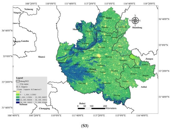 Carbon sequestration service supply pattern under different scenarios: (S1) Carbon sequestration service supply pattern under scenario S1; (S2) Carbon sequestration service supply pattern under scenario S2; (S3) Carbon sequestration service supply pattern under scenario S3.