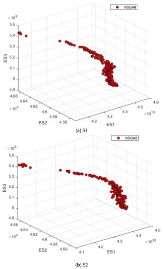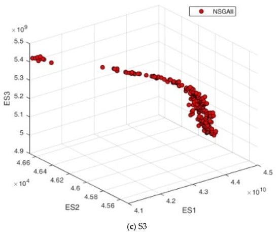 In the Matlab platform, the NSGA-II optimisation model was used to obtain water supply (ES1), water purification (N retention) (ES2), and carbon storage and sequestration (ES3) under different scenarios to determine the three-objective Pareto optimal solution set between services. The results showed 199, 197, and 197 optimal solutions for the water supply (ES1), water purification (N retention; ES2), and carbon storage and sequestration (ES3) services under S1, S2, and S3, respectively (Figure 6). Based on the Pareto curve’s optimal solution screening method, combined with the urgency of different ecosystem services in the study area, the potential of alternative resources of ecosystem services, and the surplus/shortage of total ecosystem services, we determined the three-objective Pareto optimal solution between water supply, water purification (N retention), and carbon service under S1 (442.82, 4.62, and 54.27, respectively), S2 (423.43, 4.62, and 54.06, respectively), and S3 (412.32, 4.66, and 54.20, respectively).