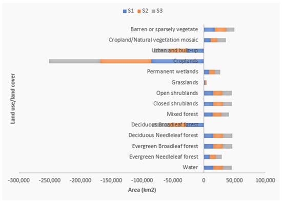 Based on the land use conversion coefficient, this study used the Matlab software platform and NSGA-II optimisation model to obtain the land use type area corresponding to the Pareto optimal solution for ecosystem services under different scenarios. To achieve the objective of ecosystem service optimisation in the study area (Table 6), deciduous broadleaf forests, croplands, and urban and built-up areas were the diversion sides in land conversion (Figure 7). Under S1, deciduous broadleaf forests, croplands, and urban and built-up areas must transfer 28,187, 84,919, and 27,151 km2, respectively. Under S2, deciduous broadleaf forests, croplands, and urban and built-up areas must transfer 28,228, 82,760, and 28,924 km2, respectively. Under S3, deciduous broadleaf forests, croplands, and urban and built-up areas require 28,174, 83,121, and 25,244 km2, respectively.