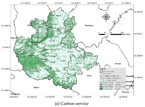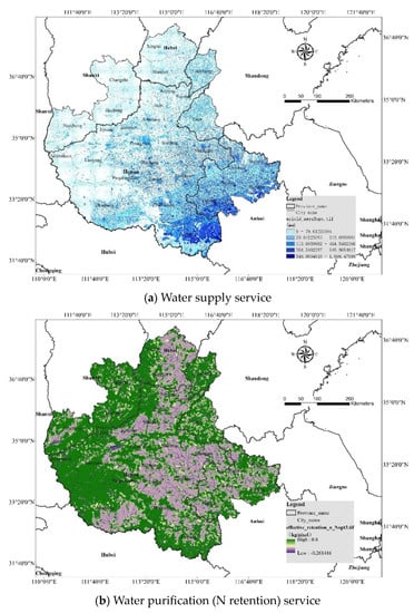 Regarding spatial distribution (Figure 3, Figure 4 and Figure 5), the water supply service has a pattern of less in the north and more in the south, and the water supply service per unit area of land gradually increased from north to south. Carbon service areas are mainly located in the Taihang and Funiu Mountains in the west and the Liankang Mountains in the south. The water purification (N retention) service had a pattern of high peripheral and low central farmland.