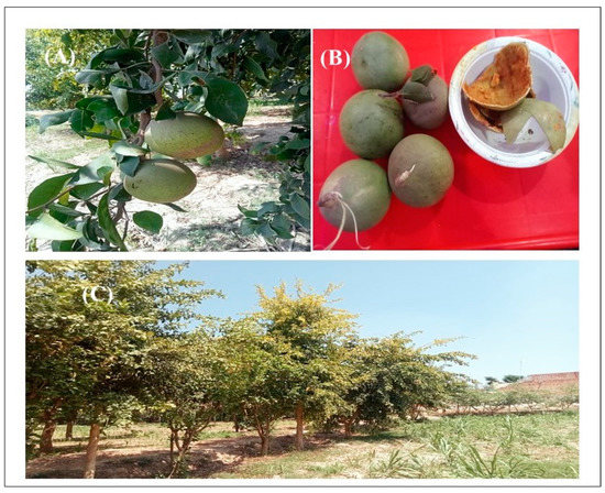 The Bael tree (Aegle marmelos) (A) branch with fruit; (B) fruit and fruit shell; (C) farmland with a number of mature trees.