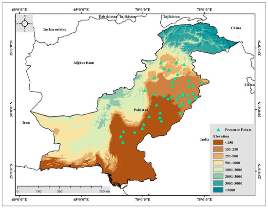 Pakistan, situated in South Asia, encompasses diverse climatic zones, including subtropical regions. The subtropical climate in Pakistan primarily occurs in the southern and coastal areas, notably in the provinces of Punjab, Sindh, and Balochistan (Figure 1). These regions experience hot summers and mild winters, accompanied by relatively high humidity levels [39]. The subtropical climate is characterized by long, hot summers, with temperatures often exceeding 40 °C, and short, mild winters, with temperatures ranging from 10 to 20 °C. The vegetation in these subtropical regions of Pakistan is diverse, comprising various shrubs, grasses, and trees that have adapted to the arid and semi-arid conditions prevalent in the area [40]. From January 2019 to December 2022, the data on Bael trees were collected from three different land-use types, namely, farmland, riverine areas, and parkland. Over the course of three years of field surveys, the authors collected data on the present locations of Aegle marmelos in Punjab, Pakistan. The main survey involved recording and geo-referencing all instances of natural populations and isolated individuals of the species. In total, the documentation of 44 records in Punjab was carried out, enabling the creation of a comprehensive distribution map of Aegle marmelos in the region (Figure 2).