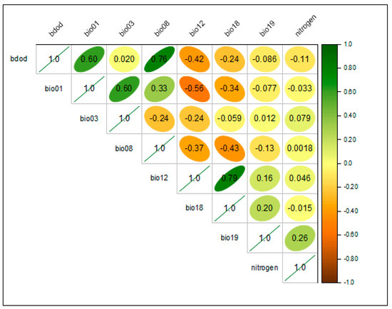Eight significant bioclimatic and edaphic variables were determined by applying the contribution and Pearson’s correlation coefficient thresholds. These factors include soil bulk density (bdod), total nitrogen, isothermality (bio03), warmest quarter precipitation (bio18), wettest quarter mean temperature (bio08), coldest quarter precipitation (bio19), yearly mean temperature (bio01), and annual precipitation (bio12) [42]. The pairwise correlation between the final variables chosen was also shown (Figure 3).