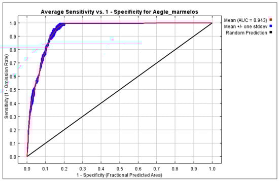 We ran MaxEnt for 10 replications and averaged the results to generate a single model prediction. This is a good practice as it helps to reduce the possible effects of random variation in the model. Response curves are a graphical representation of the link between the environmental parameters and the expected likelihood of occurrence for the species. These curves can help to identify which variables have the strongest influence on the species distribution and can aid in understanding the ecological factors driving the species distribution. The area under the curve (AUC) graph is a popular tool for evaluating how well species distribution models work. The best candidate model, with an AUC score of 0.992, was produced by using LQH as FCs in conjunction with an RM value (i.e., 1.5). (Figure 4). We used MaxEnt to construct a predictive habitat appropriateness score for the Aegle marmelos from the subtropical region of Pakistan. This score ranged from 0 to 0.99, indicating the predicted suitability of different areas for the species. The MaxEnt model’s AUC value can be used to assess the model’s predictive performance, as it measures the ability of the model to distinguish between presence and absence locations. The AUC ranged from 0.5 (no better than random) to 1.0 (perfect discrimination). It is important to note that while the AUC is a useful measure of model performance, it is not the only metric that should be considered when evaluating the model. The ROC curve represents the relationship between the true positive rate (sensitivity) and the false positive rate (1—specificity) for various projected probability threshold values. The model’s capacity to accurately identify true positives while minimizing false positives is illustrated visually. The average AUC value of the model was 0.943, which was significantly higher than the AUC value of the random prediction model (0.5), according to the results of the curve analysis. The results of the model’s predictions were believed to be extremely accurate, demonstrating a good fit between the species’ expected and actual distribution areas.